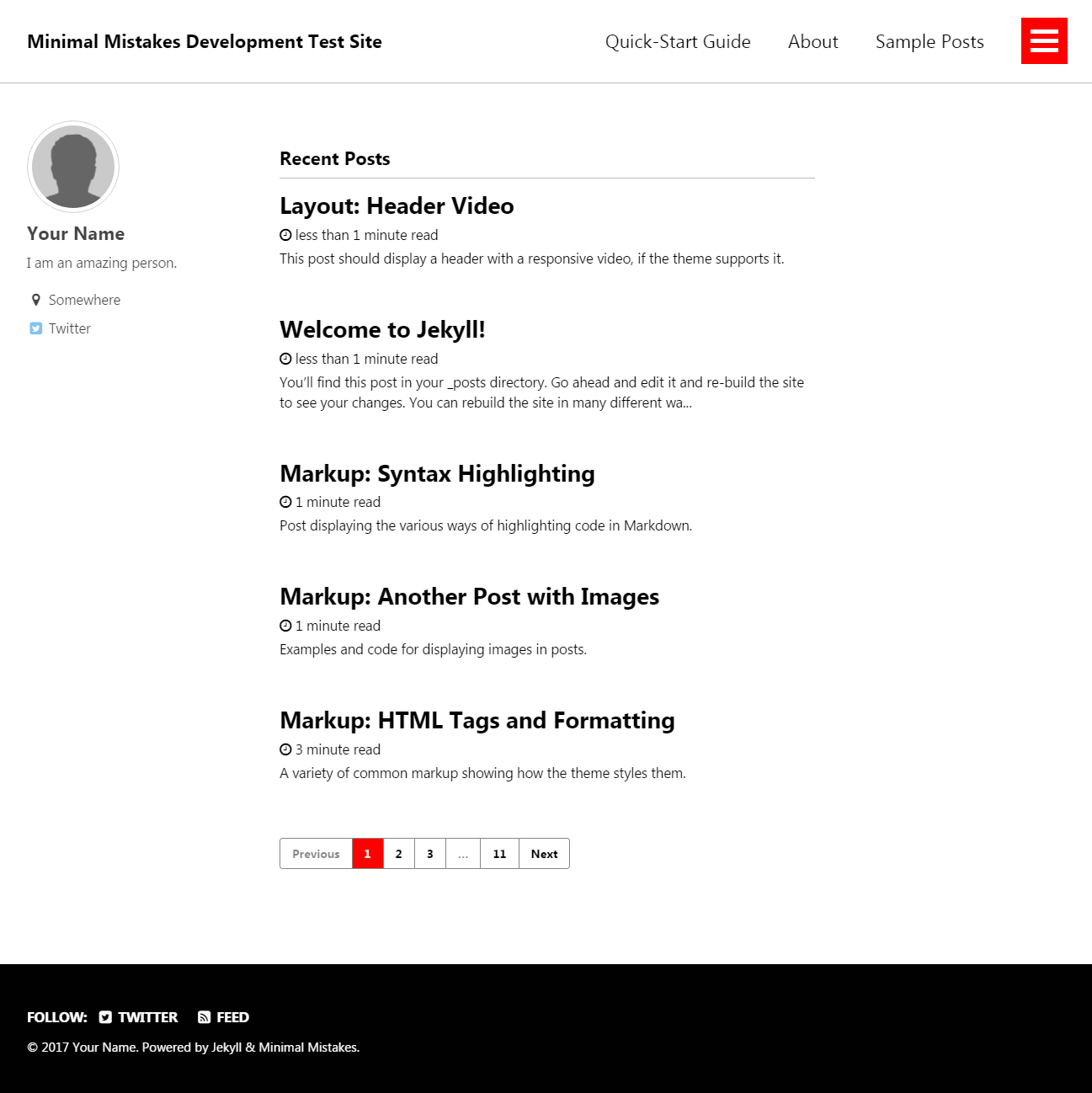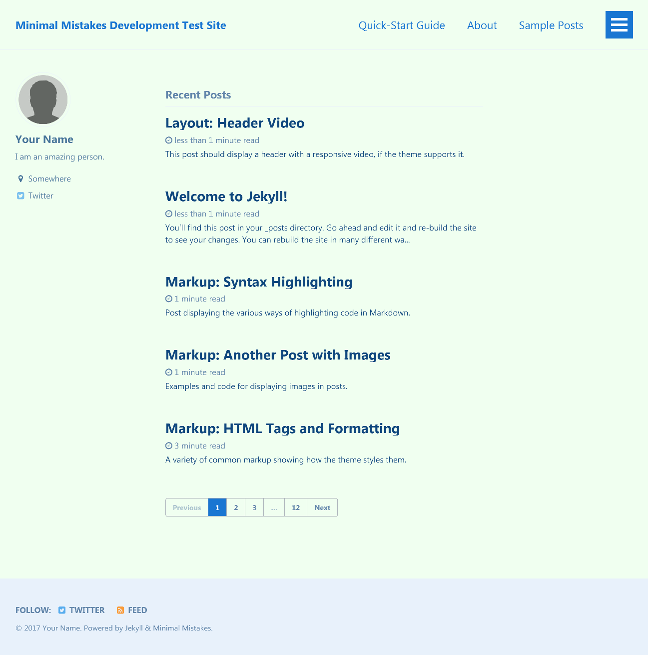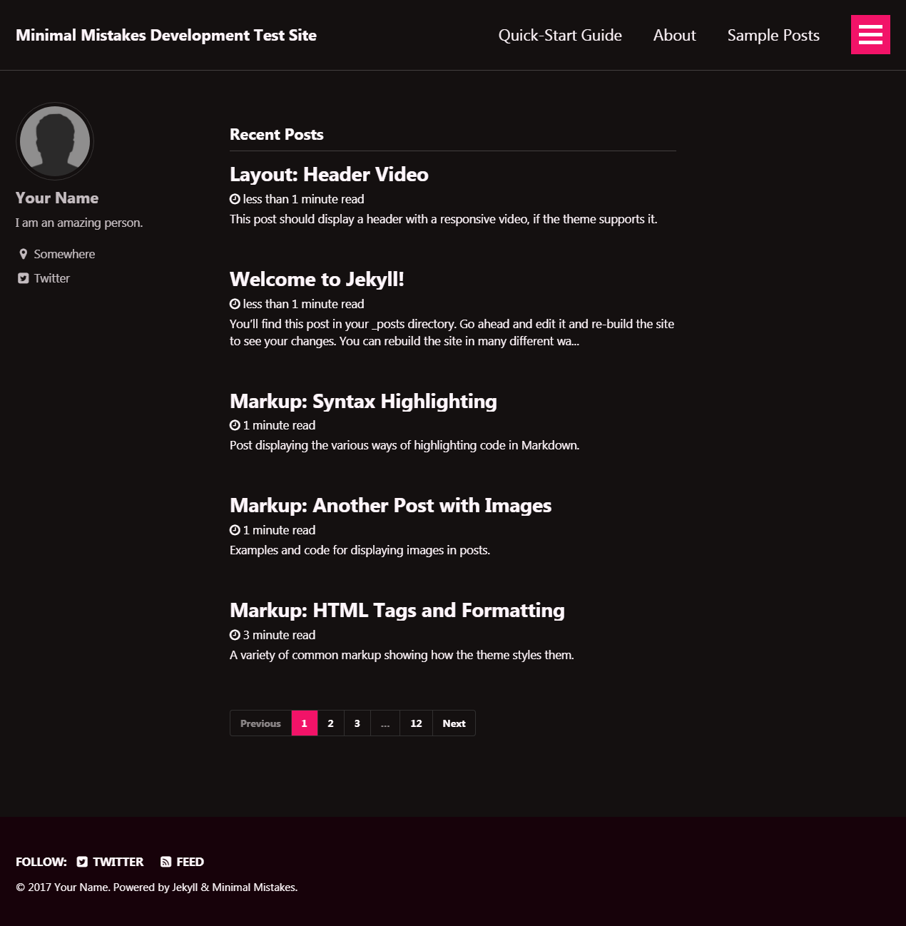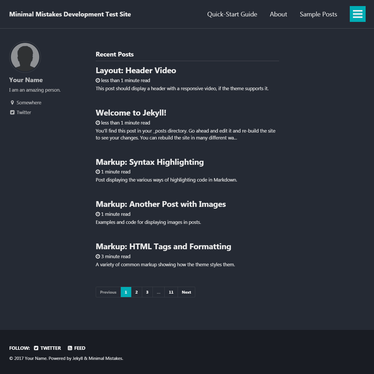 Note: There are two more configuration options from Jekyll Paginate V2 that this theme doesn’t support yet. You should either leave them out or use their default values as shown below. Changing them may lead to unexpected results and you’re on your own.