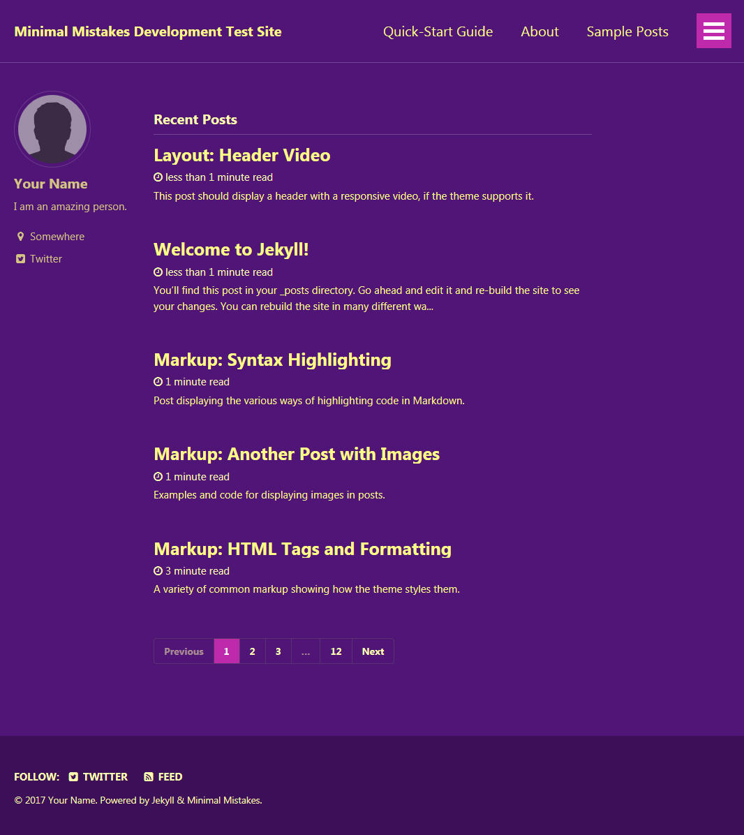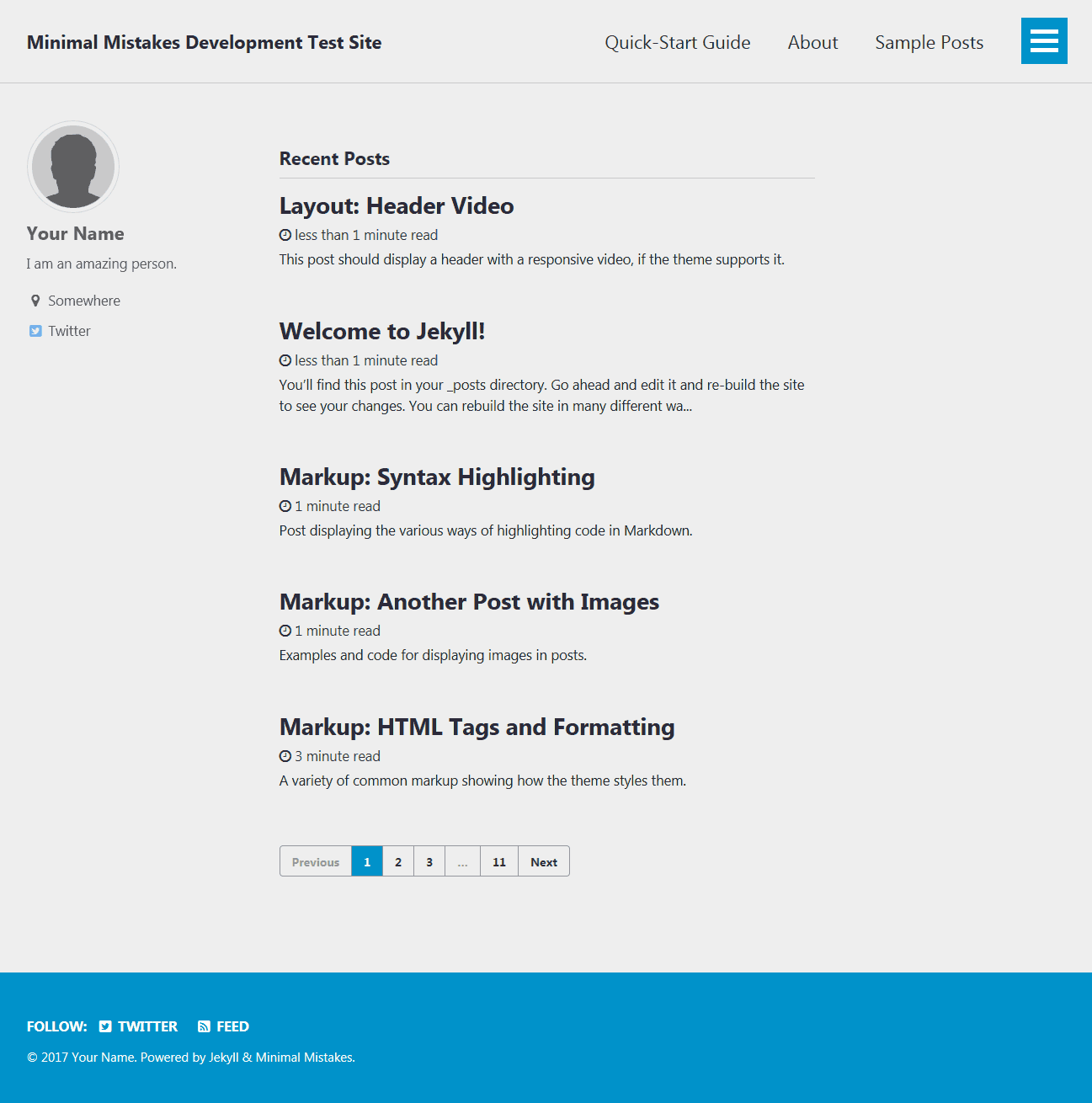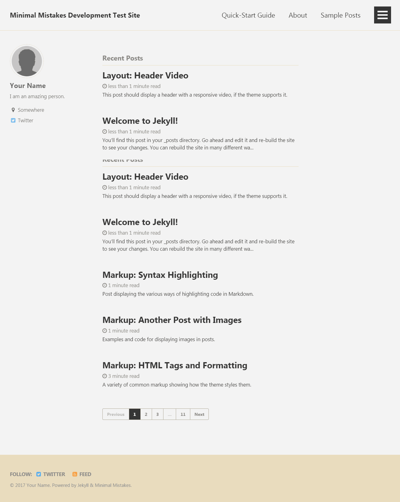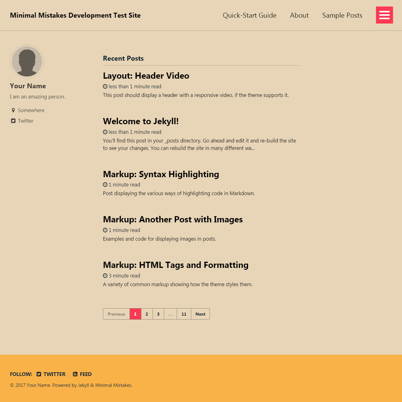 Note: There are two more configuration options from Jekyll Paginate V2 that this theme doesn’t support yet. You should either leave them out or use their default values as shown below. Changing them may lead to unexpected results and you’re on your own.