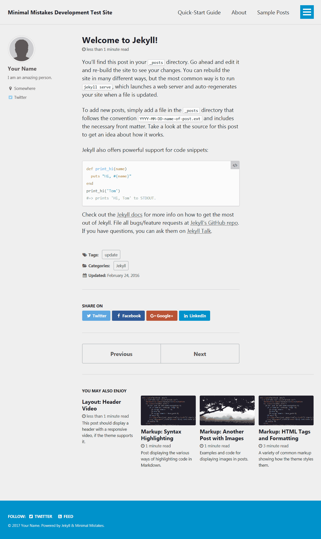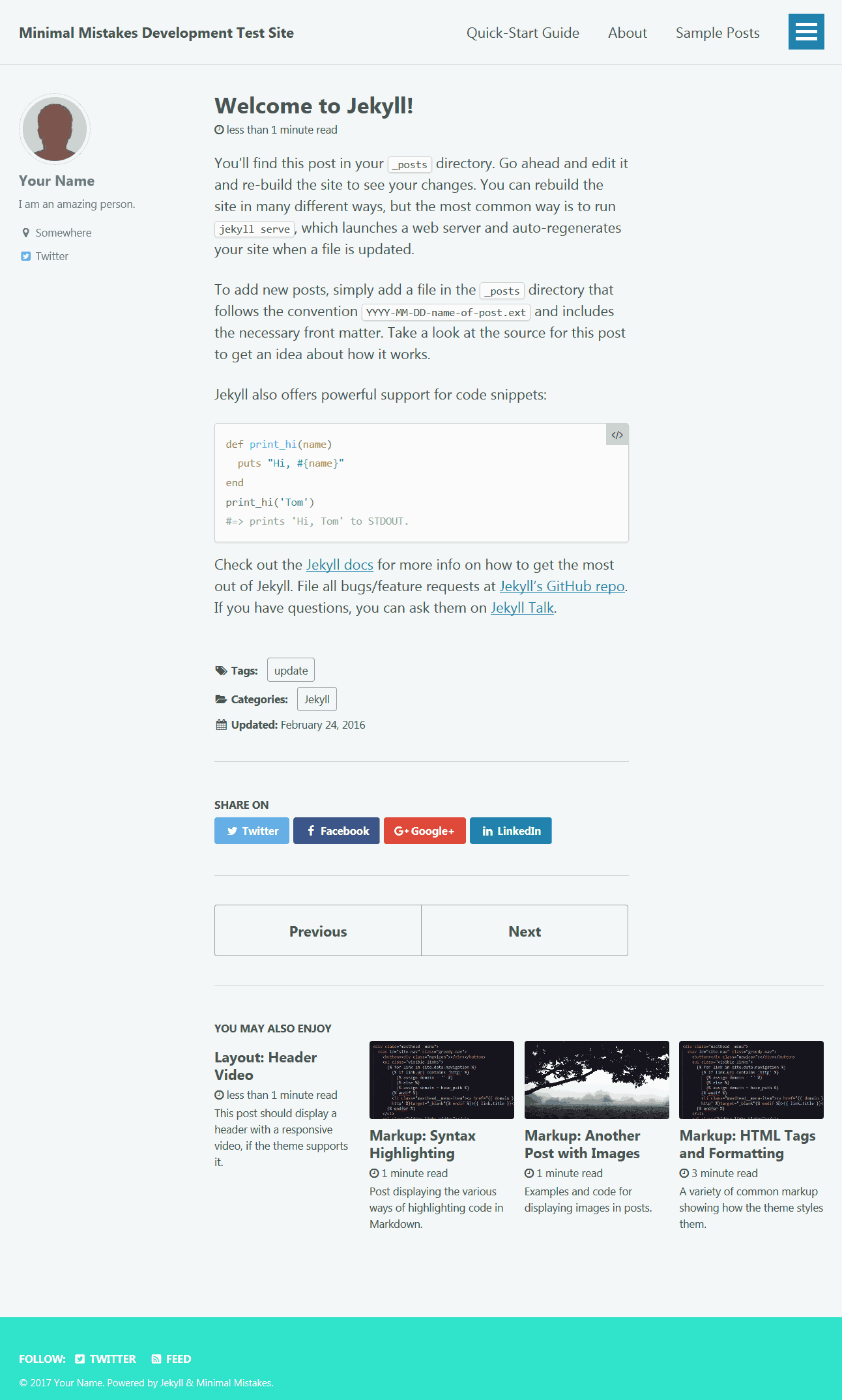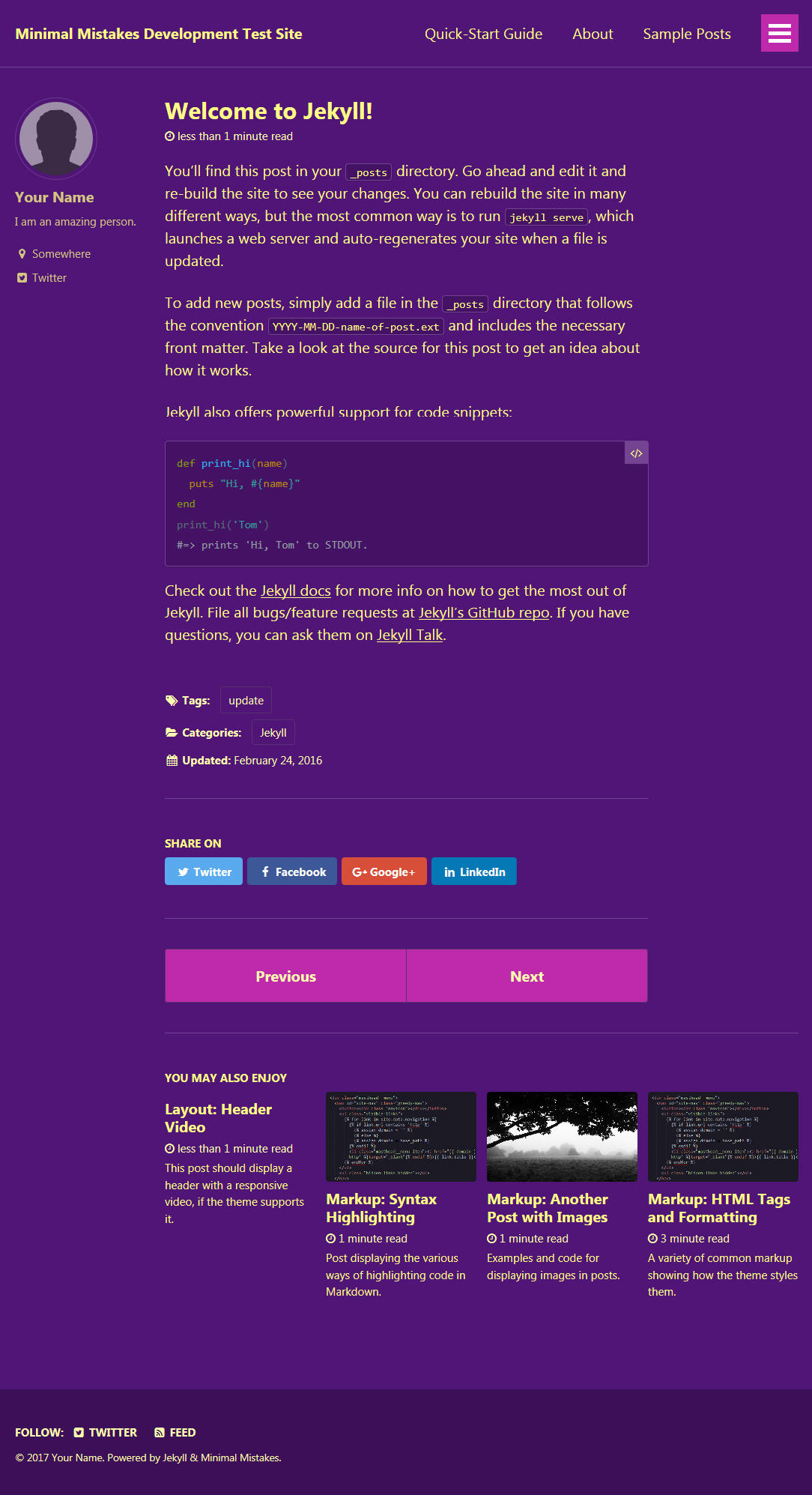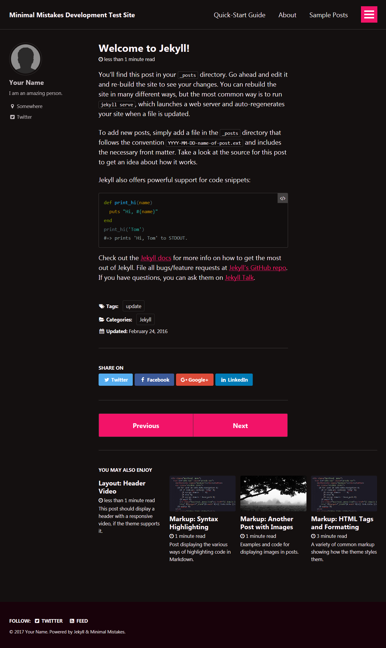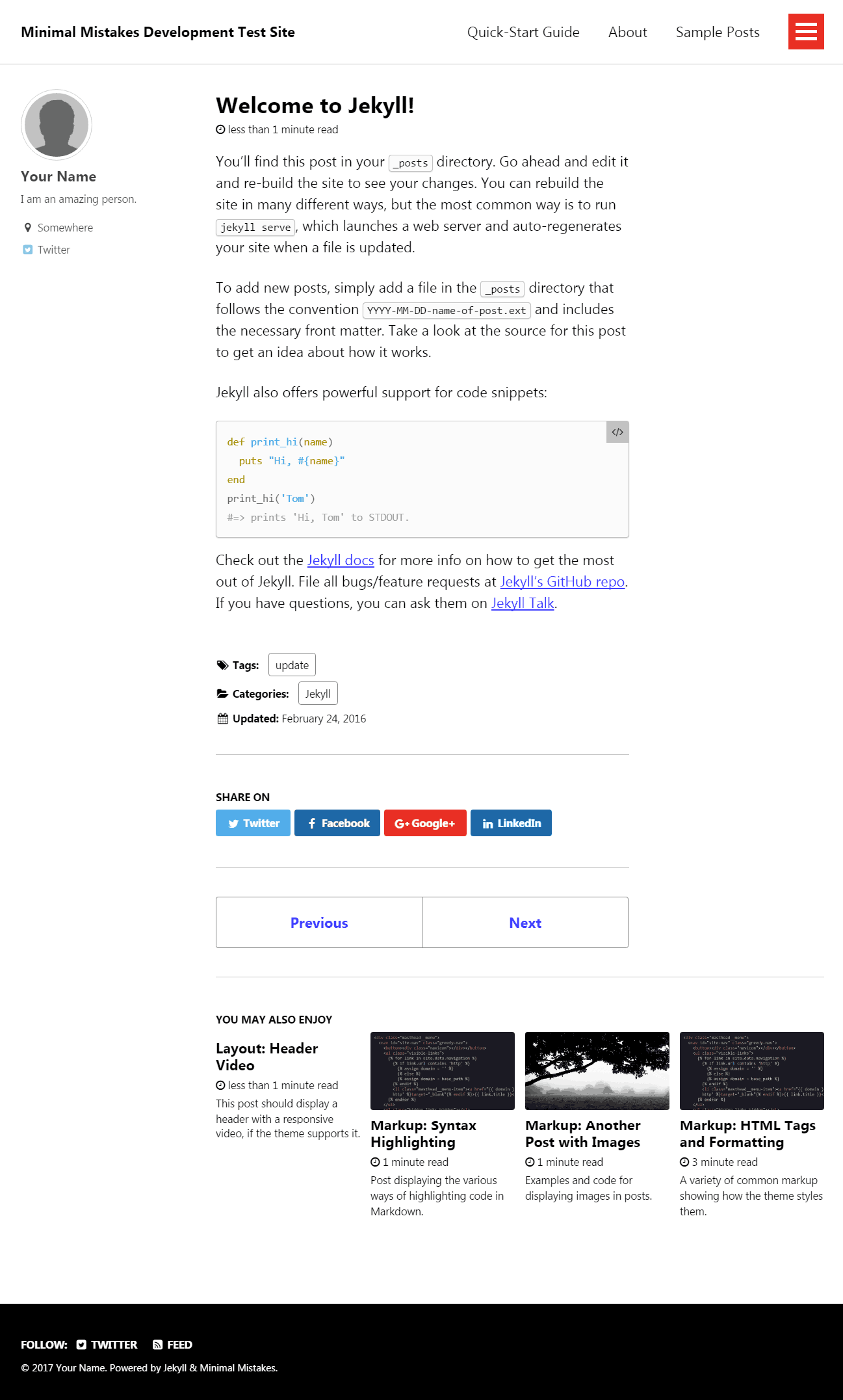 Note: for technical reasons, _config.yml is NOT reloaded automatically when used with jekyll serve. If you make any changes to this file, please restart the server process for them to be applied.