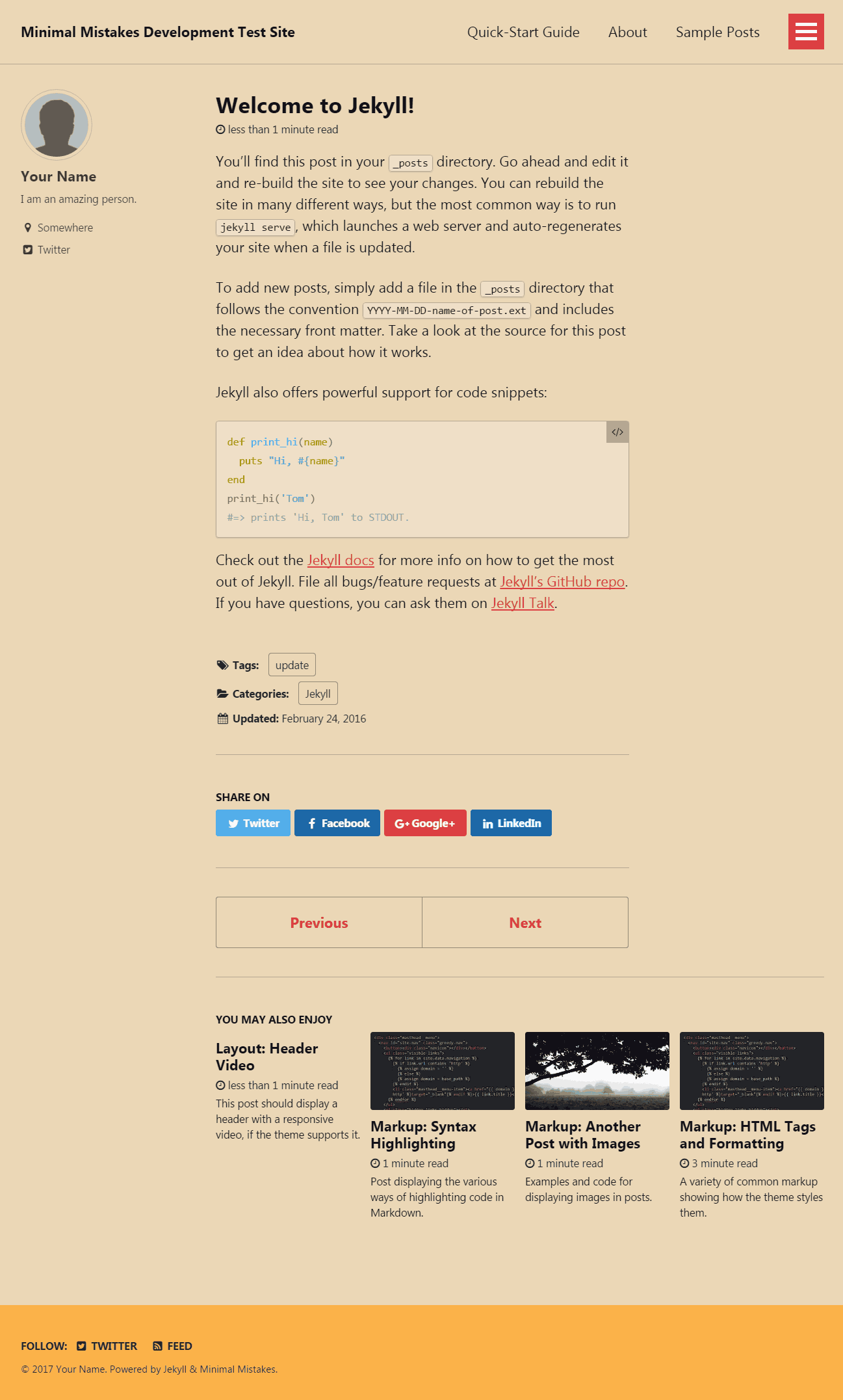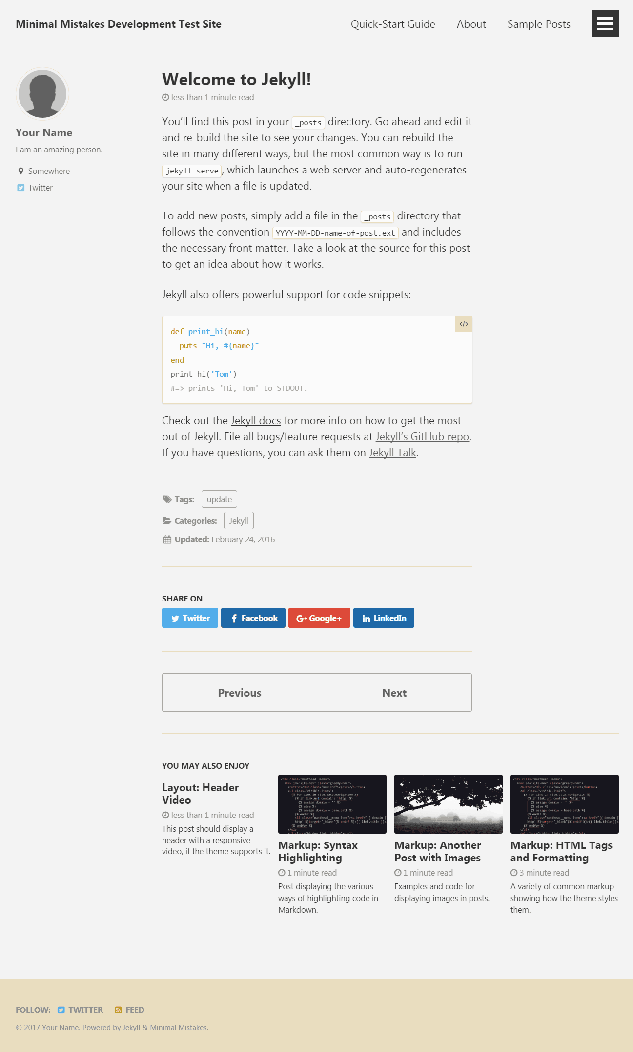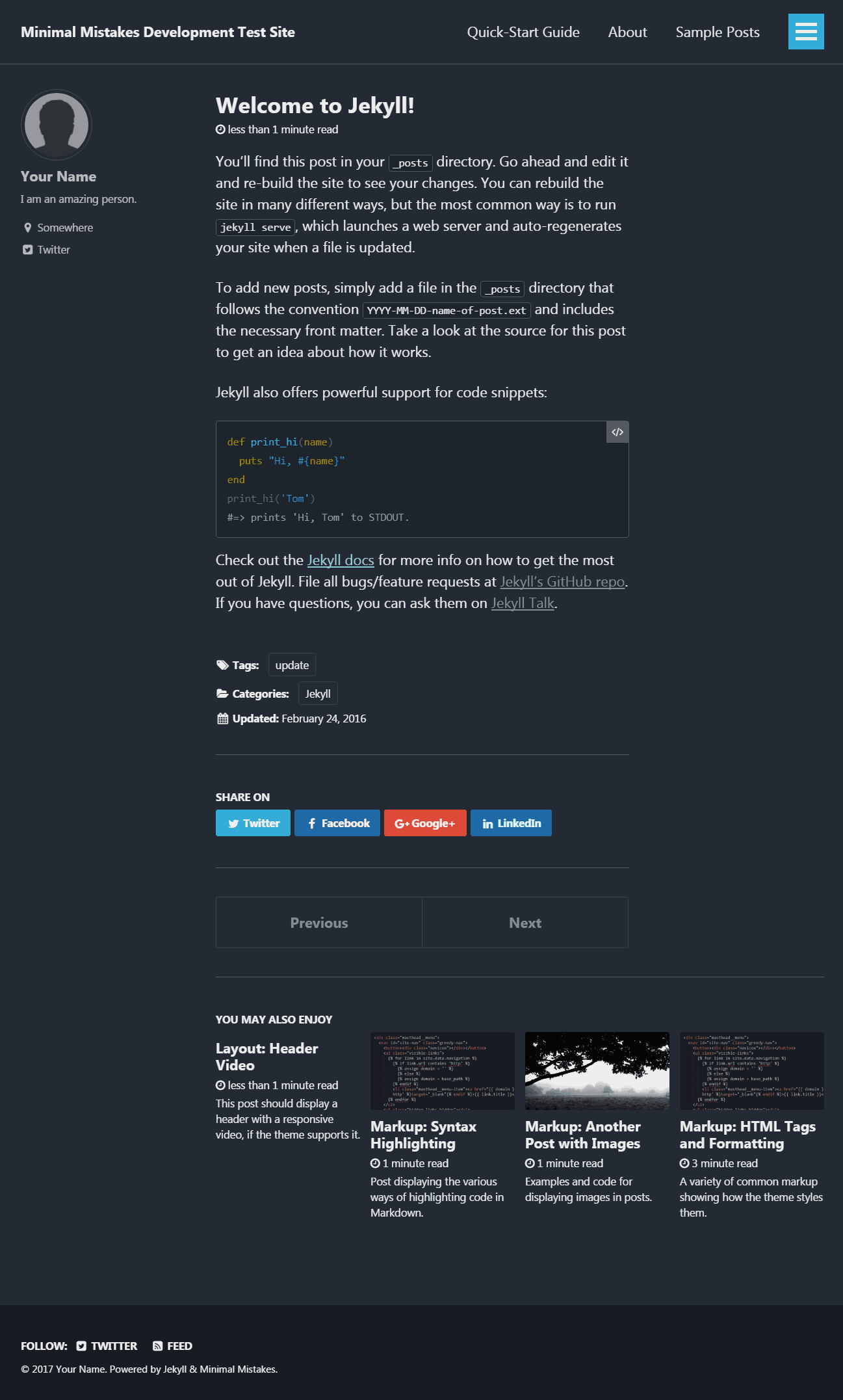 Note: The theme comes with localized text in English (en, en-US, en-GB). If you change locale in _config.yml to something else, most of the UI text will go blank. Be sure to add the corresponding locale key and translated text to _data/ui-text.yml to avoid this.